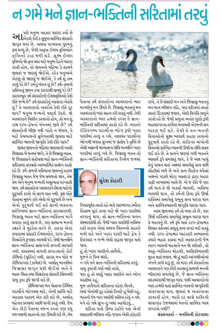 આમ જીવનમાં કર્મ તો બધા કરે છે, પણ ઊર્જા શક્તિમાં સમાયેલું પ્રભુત્વ ધારણ થાય તે મહત્વનું છે. કર્મ રૂપે થતાં રાગ-દ્વેષાત્મક વિચાર વર્તનમાં પ્રભુનું સત્ત્વ પ્રગટ થઈ શકતું નથી. રાગ-દ્વેષાત્મક અહંકારી સ્વભાવનો કચરો બહાર કાઢવા માટે આંતરડાંની જેમ ત્યાગ ભાવની મહત્તાને મન જો સ્વીકારે, તો વસ્તુ વ્યક્તિના મોહથી, માલિકીભાવથી મુક્ત થતાં જવાય. જો હું મારી આંગળીઓનાં નખને કાપી શકું છું, તો મારા કર્મ સંસ્કારોના આવરણને પણ છેદી શકવાનું સામર્થ્ય મનની ભીતરમાં સમાયેલું છે, જે જ્ઞાન-ભક્તિના સદાચરણથી જાગૃત થાય. પછી આવરણોનો ભાર હળવો થતાં સાત્ત્વિક ભાવની જાગૃતિથી અંતરયાત્રા થાય. જીવતાં જ અંતરયાત્રા કરવાની હોય, બાકી દર વરસે શરીરની વરસગાંઠ ઉજવવામાં મનનો સાત્ત્વિક ભાવ પ્રગટતો નથી!!