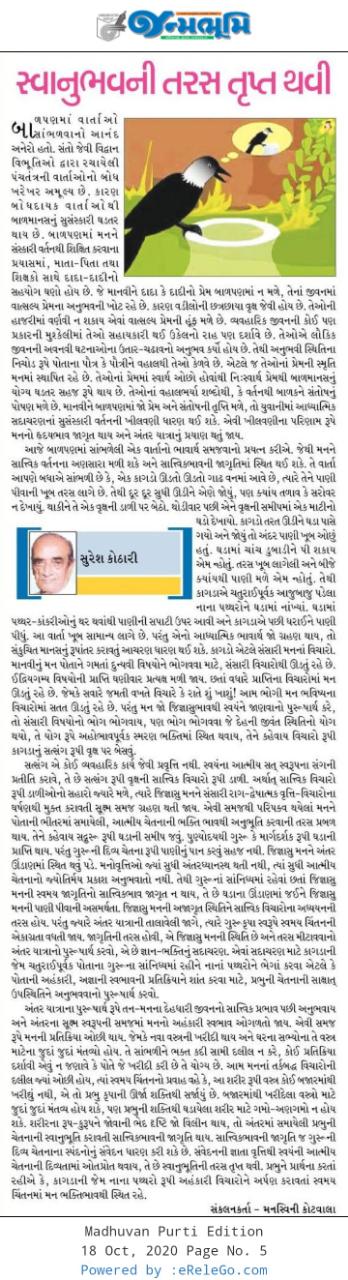 આજે બાળપણમાં સાંભળેલી એક વાર્તાનો ભાવાર્થ સમજવાનો પ્રયત્ન કરીએ. જેથી મનને સાત્ત્વિક વર્તનના અણસારા મળી શકે અને સાત્ત્વિકભાવની જાગૃતિમાં સ્થિત થઈ શકે. તે વાર્તા આપણે બધાએ સાંભળી છે કે, એક કાગડો ઊડતો ઊડતો ગાઢ વનમાં આવે છે, ત્યારે તેને પાણી પીવાની ખૂબ તરસ લાગે છે. તેથી દૂર દૂર સુધી ઊડીને એણે જોયું, પણ ક્યાંય તળાવ કે સરોવર ન દેખાયું. થાકીને તે એક વૃક્ષની ડાળી પર બેઠો. થોડીવાર પછી એને વૃક્ષની સમીપમાં એક માટીનો ઘડો દેખાયો. કાગડો તરત ઊડીને ઘડા પાસે ગયો અને જોયું તો અંદર પાણી ખૂબ ઓછું હતું. ઘડામાં ચાંચ ડુબાડીને પી શકાય એમ ન્હોતું. તરસ ખૂબ લાગેલી અને બીજે ક્યાંયથી પાણી મળે એમ ન્હોતું. તેથી કાગડાએ ચતુરાઈપૂર્વક આજુબાજુ પડેલા નાના પથ્થરોને ઘડામાં નાંખ્યાં. ઘડામાં પથ્થર-કાંકરીઓનું થર થવાંથી પાણીની સપાટી ઉપર આવી અને કાગડાએ પછી ધરાઈને પાણી પીધું. આ વાર્તા ખૂબ સામાન્ય લાગે છે. પરંતુ એનો આધ્યાત્મિક ભાવાર્થ જો ગ્રહણ થાય, તો સંકુચિત માનસનું રૂપાંતર કરાવતું આચરણ ધારણ થઈ શકે. કાગડો એટલે સંસારી મનનાં વિચારો. માનવીનું મન પોતાને ગમતાં દુન્યવી વિષયોને ભોગવવા માટે, સંસારી વિચારોથી ઊડતું રહે છે. ઈન્દ્રિયગમ્ય વિષયોની પ્રાપ્તિ ઘણીવાર પ્રત્યક્ષ મળી જાય. છતાં વધારે પ્રાપ્તિના વિચારોમાં મન ઊડતું રહે છે. જેમકે સવારે જમતી વખતે વિચારે કે રાતે શું ખાશું! આમ ભોગી મન ભવિષ્યના વિચારોમાં સતત ઊડતું રહે છે. પરંતુ મન જો જિજ્ઞાસુભાવથી સ્વયંને જાણવાનો પુરુષાર્થ કરે, તો સંસારી વિષયોનો ભોગ ભોગવાય, પણ ભોગ ભોગવવા જે દેહની જીવંત સ્થિતિનો યોગ થયો, તે યોગ રૂપે અહોભાવપૂર્વક સ્મરણ ભક્તિમાં સ્થિત થવાય, તેને કહેવાય વિચારો રૂપી કાગડાનું સત્સંગ રૂપી વૃક્ષ પર બેસવું.