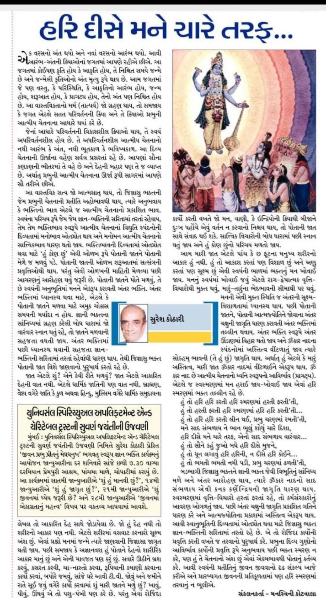આમ મારી જાત એટલે પાંચ કે છ ફૂટના મનુષ્ય શરીરનો આકાર હું નથી. હું તો આકાશ કરતાં પણ વિશાળ છું અને અણુ કરતાં પણ સૂક્ષ્મ છું એવી સ્વયંની ભાળમાં ભક્તનું મન ખોવાઈ જાય. મનનું સ્વયંમાં ખોવાઈ જવું એટલે રાગ-દ્વેષાત્મક વૃત્તિ-વિચારોથી મુક્ત થવું, મારું-તારુંના ભેદભાવની સીમાથી પર થવું. મનની એવી મુક્ત સ્થિતિ જ અંતરની સૂક્ષ્મ-વિશાળતામાં ધ્યાનસ્થ થાય. પછી પોતાની જાતને, પોતાની આત્મજ્યોતિને જોવાના અંતર ચક્ષુની જાગૃતિ ધારણ કરાવતી અંતર ભક્તિમાં તલ્લીન થવાય. અંતર ભક્તિ સ્વરૂપે અંતર ઊંડાણમાં વિહાર થતો જાય અને ૐકાર નાદના સ્પંદનોમાં અસ્તિત્વ વીંટળાતું જાય ત્યારે સોહમ્ ભાવની(તે હું છું) જાગૃતિ થાય. અર્થાત્ હું એટલે કે મારું અસ્તિત્વ, મારી જાત ૐકાર નાદમાં વીંટળાઈને એકરૂપ થાય. કાર નાદ છે આત્મીય ચેતનાનો ધ્વનિ સ્વરૂપનો આવિર્ભાવ(પ્રાગટ્ય). એટલે જ સ્વ સ્મરણમાં મન હરાઈ જાય-ખોવાઈ જાય એવાં હરિ સ્મરણમાં ભક્ત તલ્લીન રહે છે. હું તો હરિ હરિ કરતી હરિ સ્મરણમાં હરતી ફરતી’તી, હું તો હરતી ફરતી કિંર સ્મરણમાં હરિ હરિ કરતી'તી... હું તો હરિ હરિ કરતી લીન થઈ, પ્રભુ ચરણમાં રમતી'તી, મને સાદ સંભળાય ને ભાન ભૂલું શોધું ચારે દિશા, હર દીસે મને ચારે તરફ, એનો સાદ સંભળાય વારંવાર... હું તો સૌને કહ્યું જુઓ બધે દિર દીસે મુજને, હું તો ધૂન લગાવું હરિ હરિની, ન દીસે હરિ કોઈને... હું તો ભમતી ભમતી નમી પડી, પ્રભુ ચરણમાં ઢળતી'તી, બડભાગી જિજ્ઞાસુ ભક્તને જ્ઞાની ભક્ત જેવી વિભૂતિનું સાંનિધ્ય મળે અને અંતર આરોહણ થાય, ત્યારે ૐકાર નાદનો સાદ સંભળાય એવી કનક કર્મેન્દ્રિયની જાગૃતિ ધારણ થાય. સ્વ સ્મરણમાં વૃત્તિ-વિચારો હરતાં ફરતાં રહે, તો કર્મસંસ્કારોનું આવરણ ઓગળતું જાય. પછી અંતર ચક્ષુની જાગૃતિ પ્રકાશિત ગતિને ધારણ કરે અને આત્મજ્યોતિના પ્રકાશમાં અસ્તિત્વ એકરૂપ થાય. આવી સ્વાનુભૂતિની દિવ્યતામાં ઓતપ્રોત થવા માટે જિજ્ઞાસુ ભક્ત જ્ઞાન-ભક્તિની સરિતામાં તરતો રહે છે. એ તો રોજિંદા કાર્યોની પ્રવૃત્તિ કરતી વખતે જ તરવાનો પુરુષાર્થ કરે. પ્રભુના જ દિવ્ય ગુણોનો આવિર્ભાવ કાર્યોની પ્રવૃત્તિ રૂપે અનુભવાય પછી ભક્ત સ્મરણ ન કરે, પણ હું તે ચેતનાનો અંશ છું એવાં એકમભાવથી પોતાનું કર્તવ્ય કરે. આવી સ્વયંની પ્રતીતિનું જીવન જીવવાનો દઢ સંકલ્પ આજે કરીએ અને પ્રારબ્ધગત જીવનની પ્રતિકૂળતામાં પણ હરિ સ્મરણમાં તરવાનું ન ભૂલીએ.