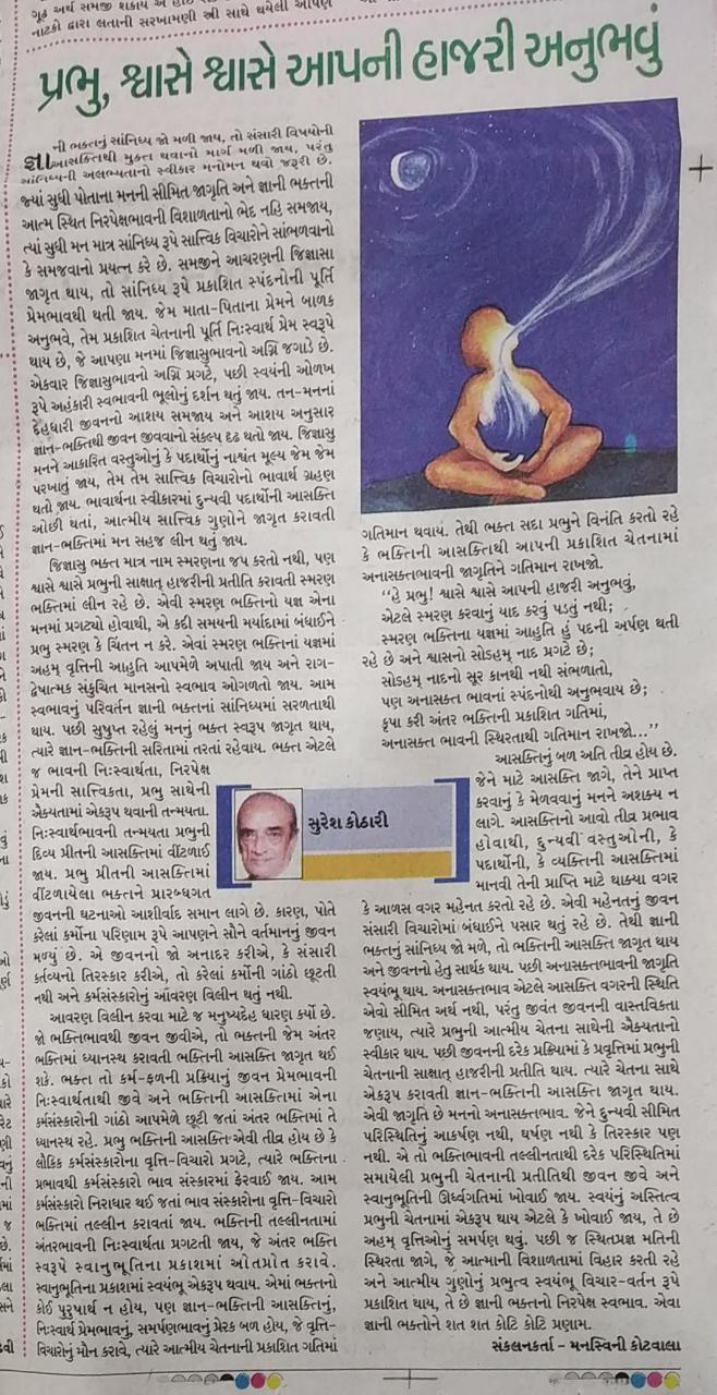“હે પ્રભુ! શ્વાસે શ્વાસે આપની હાજરી અનુભવું, એટલે સ્મરણ કરવાનું યાદ કરવું પડતું નથી; સ્મરણ ભક્તિના યજ્ઞમાં આહુતિ પદની અર્પણ થતી રહે છે અને શ્વાસનો સોહમ્ નાદ પ્રગટે છે; સોહમ્ નાદનો સૂર કાનથી નથી સંભળાતો, પણ અનાસક્ત ભાવના સ્પંદનોચી અનુભવાય છે; કૃપા કરી અંતર ભક્તિની પ્રકાશિત ગતિમાં, અનાસક્ત ભાવની સ્થિરતાથી ગતિમાન રાખજો...’