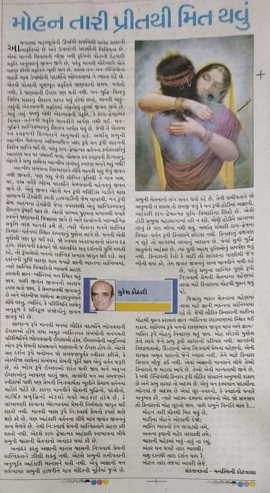 આ જગતમાં મહાભૂતોની ઊર્જાથી સર્જાયેલી અનેક પ્રકારની આકૃતિઓ છે અને ઉપભોગી પદાર્થોની વિવિધતા છે. એમાં માનવી સિવાયની બીજી બધી કૃતિઓ પોતાની દેહધારી પ્રકૃતિ અનુસારનું જીવન જીવે છે. પરંતુ માનવી મોટેભાગે પોતે ધારણ કરેલી પ્રકૃતિને ભૂલી જાય છે. કારણ તન-મન-ઈન્દ્રિયોના સહારે માત્ર ઉપભોગી પદાર્થોને ભોગવવામાં તે વ્યસ્ત રહે છે. એટલે પોતાની મૂળભૂત પ્રકૃતિને જાણવાનો સમય મળતો નથી, કે જાણવાની ઈચ્છા પણ થતી નથી. મન-બુદ્ધિ-ચિત્તનું વિશેષ પ્રકારનું કૌશલ્ય પ્રાપ્ત થયું હોવાં છતાં, માનવી મારું-તારુંની ભેદભાવની પ્રકૃતિમાં બંધાયેલું તુચ્છ જીવન જીવે છે. મારું-તારું-પરાયું એવી ભેદભાવની પ્રકૃતિ, કે રાગ-દ્વેષાત્મક વિચાર-વર્તનની પ્રકૃતિ માનવીને અર્પણ નથી થઈ. મન-બુદ્ધિને સાત્ત્વિકભાવનું કોશલ્પ અર્પણ થયું છે, જેથી તે પોતાના સ્વ સ્વરૂપની દિવ્યતાને અનુભવી શકે. અર્થાત્ પ્રભુની આત્મીય ચેતનાના અવિભાજિત અંશ રૂપે મન રૂપી વાહનની વિશેષ પ્રાપ્તિ થઇ છે. પરંતુ રાગ- દ્વેષાત્મક વર્તનના કર્મસંસ્કારોનું આવરણ મન પર પથરાઈ જતાં, પોતાના સ્વ સ્વરૂપની દિવ્યતાનું, એટલે કે પ્રભુ સાથેના અાત્મીય સંબંધનું સ્મરણ મનને થતું નથી!