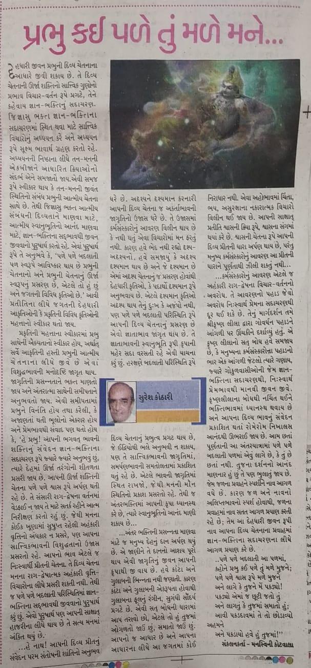 ..કર્મસંસ્કારોનું આવરણ એટલે જ અહંકારી રાગ-દ્વેષના વિચાર-વર્તનનો અવરોધ. તે આવરણનો પહાડ જેવો અવરોધ નિઃસ્વાર્થ પ્રેમના સદાચરણથી દૂર થઈ શકે છે. તેનું માર્ગદર્શન તમે શ્રીકૃષ્ણ લીલા દ્વારા ગોવર્ધન પહાડને આંગળી પર ઊંચકીને દર્શાવ્યું હતું. એ કૃષ્ણ લીલાનો સત્ બોધ હવે સમજાય છે, કે મનુષ્યના કર્મસંસ્કારોના પહાડનો ભાર એક આંગળી જેટલો ત્યારે ગણાય, જ્યારે ગોકુળવાસીઓની જેમ જ્ઞાન-ભક્તિના સદાચરણથી, નિઃસ્વાર્થ પ્રેમભાવથી માનવી જીવન જીવે. કૃષ્ણલીલાના બોધથી નચિંત થઈને ભક્તિભાવમાં ધ્યાનસ્થ થવાય છે અને આપના દિવ્ય ભાવનું સંવેદન પ્રકાશિત થતાં રોમેરોમ નિખાલસ આનંદથી ઊભરાઈ જાય છે. આમ છતાં પૂર્ણતાની આ અંતરયાત્રામાં પળે પળે બદલાતી પળમાં એવું લાગે છે, કે તું છે છતાં નથી. તુજના દર્શનનો આનંદ માણનાર હું છું તે પણ ભુલાતું જાય છે. જેમ જળના પ્રવાહને સ્પર્શીને નાવ આગળ વધે છે. કારણ જળ અને નાવનો અલિમભાવનો સ્પર્શ હોવાંથી, જળના પ્રવાહમાં નાવ સતત આગળ પ્રયાણ કરતી રહે છે; તેમ આ દેહધારી જીવન રૂપી નાવ આપનાં દિવ્ય ચેતનાના પ્રવાહમાં જ્ઞાન-ભક્તિના સદાચરણના લીધે આગળ પ્રયાણ કરે છે.