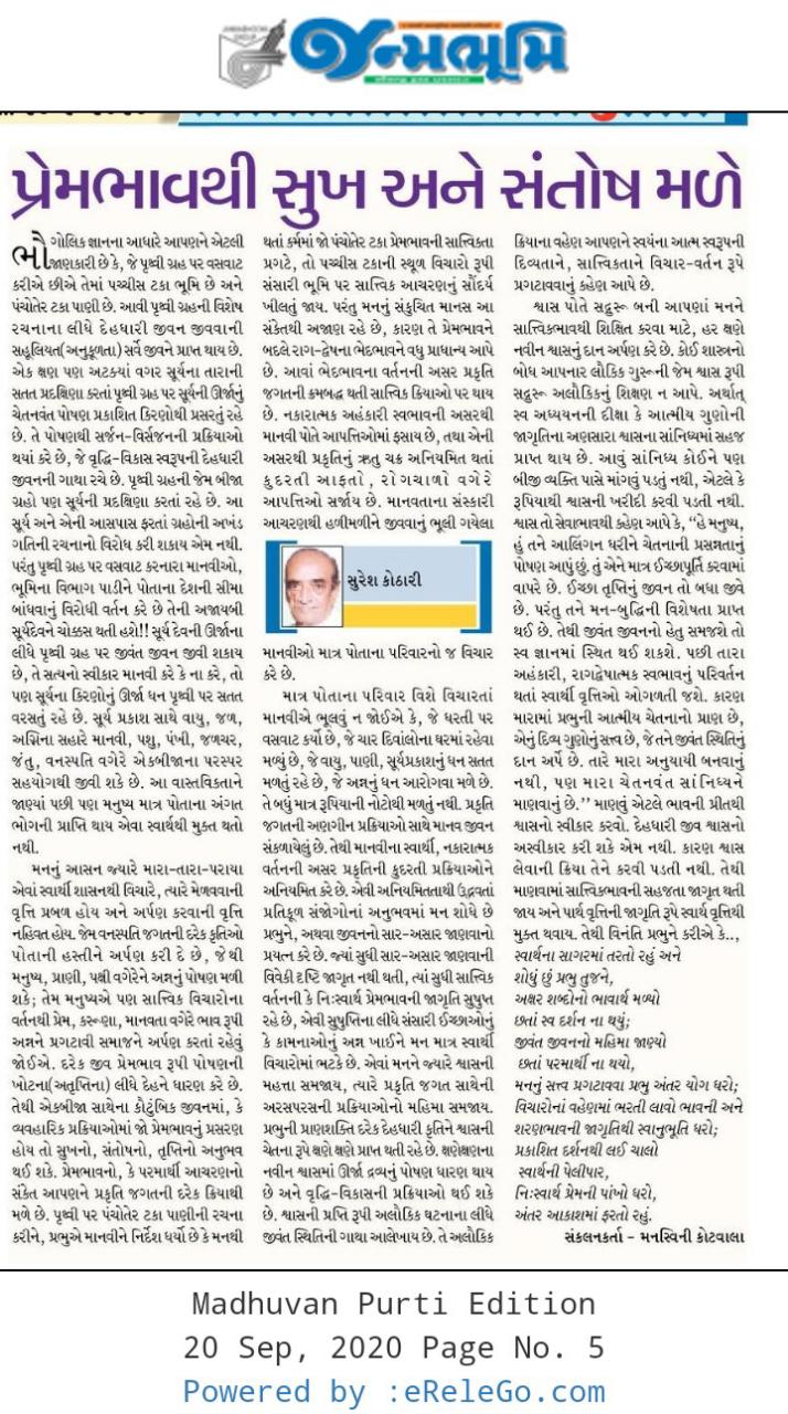 મનનું આસન જ્યારે મારા-તારા-પરાયા એવાં સ્વાર્થી શાસનથી વિચારે, ત્યારે મેળવવાની વૃત્તિ પ્રબળ હોય અને અર્પણ કરવાની વૃત્તિ નહિવત હોય. જેમ વનસ્પતિ જગતની દરેક કૃતિઓ પોતાની હસ્તીને અર્પણ કરી દે છે, જેથી મનુષ્ય, પ્રાણી, પક્ષી વગેરેને અન્નનું પોષણ મળી શકે; તેમ મનુષ્યએ પણ સાત્ત્વિક વિચારોના વર્તનથી પ્રેમ, કરુણા, માનવતા વગેરે ભાવ રૂપી અન્નને પ્રગટાવી સમાજને અર્પણ કરતાં રહેવું જોઈએ. દરેક જીવ પ્રેમભાવ રૂપી પોષણની ખોટના(અતૃપ્તિના) લીધે દેહને ધારણ કરે છે. તેથી એકબીજા સાથેના કૌટુંબિક જીવનમાં, કે વ્યવહારિક પ્રક્રિયાઓમાં જો પ્રેમભાવનું પ્રસરણ હોય તો સુખનો, સંતોષનો, તૃપ્તિનો અનુભવ થઈ શકે. પ્રેમભાવનો, કે પરમાર્થી આચરણનો સંકેત આપણને પ્રકૃતિ જગતની દરેક ક્રિયાથી મળે છે. પૃથ્વી પર પંચોતેર ટકા પાણીની રચના કરીને, પ્રભુએ માનવીને નિર્દેશ ધર્યો છે કે મનથી થતાં કર્મમાં જો પંચોતેર ટકા પ્રેમભાવની સાત્ત્વિકતા પ્રગટે, તો પચ્ચીસ ટકાની સ્થૂળ વિચારો રૂપી સંસારી ભૂમિ પર સાત્ત્વિક આચરણનું સૌંદર્ય ખીલતું જાય. પરંતુ મનનું સંકુચિત માનસ આ સંકેતથી અજાણ રહે છે, કારણ તે પ્રેમભાવને બદલે રાગ-દ્વેષના ભેદભાવને વધુ પ્રાધાન્ય આપે છે. આવાં ભેદભાવના વર્તનની અસર પ્રકૃતિ જગતની ક્રમબદ્ધ થતી સાત્ત્વિક ક્રિયાઓ પર થાય છે. નકારાત્મક અહંકારી સ્વભાવની અસરથી માનવી પોતે આપત્તિઓમાં ફસાય છે, તથા એની અસરથી પ્રકૃતિનું ઋતુ ચક્ર અનિયમિત થતાં કુદરતી આફતો, રોગચાળો વગેરે આપત્તિઓ સર્જાય છે. માનવતાના સંસ્કારી આચરણથી હળીમળીને જીવવાનું ભૂલી ગયેલા માનવીઓ માત્ર પોતાના પરિવારનો જ વિચાર કરે છે.