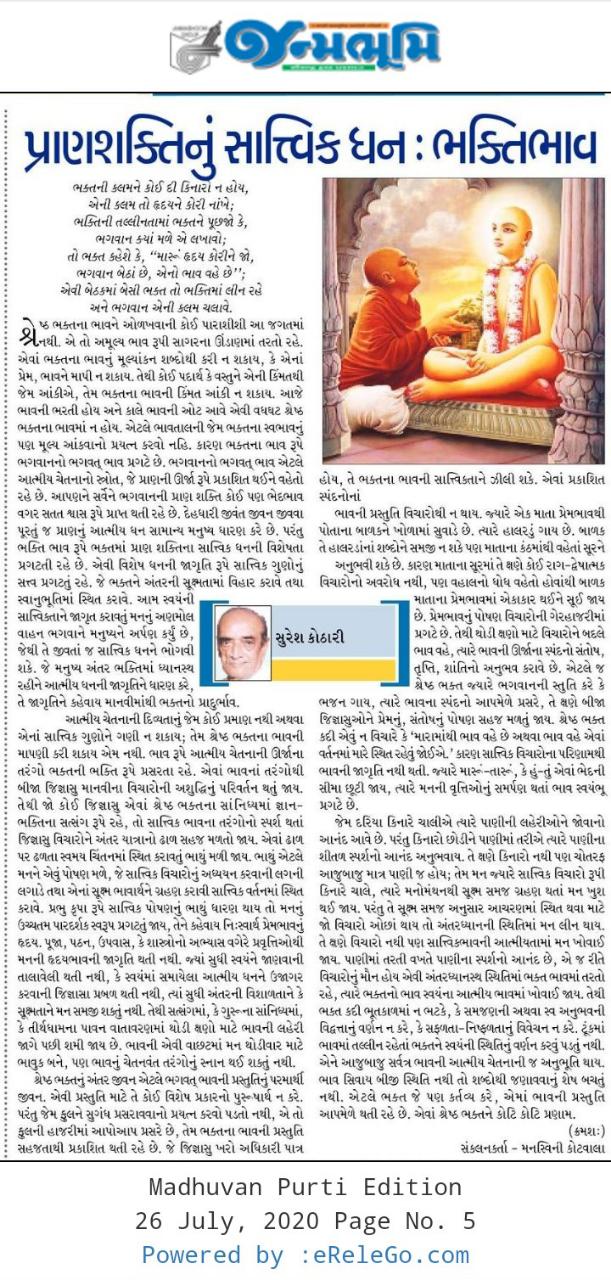 આત્મીય ચેતનાની દિવ્યતાનું જેમ કોઈ પ્રમાણ નથી અથવા એનાં સાત્ત્વિક ગુણોને ગણી ન શકાય; તેમ શ્રેષ્ઠ ભક્તના ભાવની માપણી કરી શકાય એમ નથી. ભાવ રૂપે આત્મીય ચેતનાની ઊર્જાના તરંગો ભક્તની ભક્તિ રૂપે પ્રસરતા રહે. એવાં ભાવનાં તરંગોથી બીજા જિજ્ઞાસુ માનવીના વિચારોની અશુદ્ધિનું પરિવર્તન થતું જાય. તેથી જો કોઈ જિજ્ઞાસુ એવાં શ્રેષ્ઠ ભક્તના સાંનિધ્યમાં જ્ઞાન-ભક્તિના સત્સંગ રૂપે રહે, તો સાત્ત્વિક ભાવના તરંગોનો સ્પર્શ થતાં જિજ્ઞાસુ વિચારોને અંતર યાત્રાનો ઢાળ સહજ મળતો જાય. એવાં ઢાળ પર ઢળતા સ્વમય ચતનમાં સ્થિત કરાવતું ભાથું મળી જાય. ભાથું એટલે મનને એવું પોષણ મળે, જે સાત્ત્વિક વિચારોનું અધ્યયન કરવાની લગની લગાડે તથા એનાં સૂક્ષ્મ ભાવાર્થને ગ્રહણ કરાવી સાત્ત્વિક વર્તનમાં સ્થિત કરાવે. પ્રભુ કૃપા રૂપે સાત્ત્વિક પોષણનું ભાથું ધારણ થાય તો મનનું ઉચ્ચતમ પારદર્શક સ્વરૂપ પ્રગટતું જાય, તેને કહેવાય નિ:સ્વાર્થ પ્રેમભાવનું હૃદય. પૂજા, પઠન, ઉપવાસ, કે શાસ્ત્રોનો અભ્યાસ વગેરે પ્રવૃત્તિઓથી મનની હૃદયભાવની જાગૃતિ થતી નથી. જ્યાં સુધી સ્વયંને જાણવાની તાલાવેલી થતી નથી, કે સ્વયંમાં સમાયેલા આત્મીય ધનને ઉજાગર કરવાની જિજ્ઞાસા પ્રબળ થતી નથી, ત્યાં સુધી અંતરની વિશાળતાને કે સૂક્ષ્મતાને મન સમજી શકતું નથી. તેથી સત્સંગમાં, કે ગુરુના સાંનિધ્યમાં, કે તીર્થધામના પાવન વાતાવરણમાં થોડી ક્ષણો માટે ભાવની લહેરી જાગે પછી શમી જાય છે. ભાવની એવી વાછટમાં મન થોડીવાર માટે ભાવુક બને, પણ ભાવનું ચેતનવંત તરંગોનું સ્નાન થઈ શકતું નથી.