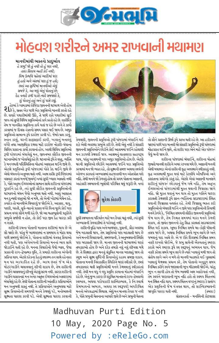 શરીરની વૃદ્ધિ થાય અને બાળપણ, યુવાની, પ્રૌઢ અવસ્થા જેમ બદલાતી જાય, તેમ પ્રવૃત્તિઓ પણ બદલાતી જાય છે અને મનની વિચારવાની, સમજવાની, કે અનુભવવાની સ્થિતિ પણ બદલાતી જાય છે. માનવ જીવનની ઘટમાળમાં ઘણાં તબક્કાઓ હોય છે અને દરેક તબક્કે નવું નવું શીખવા મળે છે. તે શિક્ષણ દ્વારા મનનું સંકુચિત માનસ બદલાતું જાય તો સ્થૂળ અને સૂક્ષ્મ સૃષ્ટિની ક્રિયાઓનું રહસ્ય સમજી શકાય. પોતાના મનની નિરાકારિત સ્થિતિને ઘણાં સ્વીકારે છે, છતાં તબક્કાવાર થતી પ્રવૃત્તિઓથી મનને કેળવવાનું સ્વીકારતાં નથી. તેથી મન વધુ ને વધુ પ્રવૃત્તિ કરવાના મોહમાં બંધાઈને રહે છે. એનું મુખ્ય કારણ છે સંકુચિત માનસનો રાગ-દ્વેષવાળો સ્વભાવ, અથવા પરોપકારી સાત્ત્વિકભાવ, કે નિ:સ્વાર્થ પ્રેમભાવનો અભાવ, અથવા સ્વ સ્વરૂપથી અપરિચિત મનનો અંધશ્રદ્ધામાં વિશ્વાસ. એવું મન માનવા તૈયાર જ નથી કે, પોતે પ્રભુની ચેતનાના આધારે જીવે છે અને પ્રભુની ચેતના તો સૌને પ્રાણની ઊર્જા રૂપે પ્રાપ્ત થતી રહે છે. આ હકીકતને જાણ્યાં પછી પણ માનવી જો સંસારી પ્રવૃત્તિઓ રૂપી પાંજરામાં મોહગ્રસ્ત થઈને જીવે, તો શરીર પણ એને માટે એક પાંજરું જેવું બની જાય છે.
