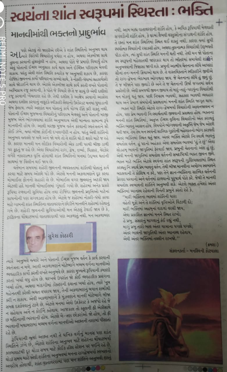 ભક્ત માટે શાંત સ્થિતિ એટલે રાગ-દ્વેષભર્યા વિચારોની આવનજાવન ન હોય, પણ પ્રેમ ભાવની નિ:સ્વાર્થતાથી જીવવાની પ્રસન્નતા હોય. ભક્તના મનની શાંત સ્થિતિમાં, અતૃપ્ત ઈચ્છા વૃત્તિના વિચારોનો અંત કરાવતું ભક્તિ ભાવનું આસન હોય. વિષયોને ભોગવવાની અતૃપ્તિ જેમ જેમ ઓછી થતી જાય, તેમ તેમ મન સ્વયંની સાત્ત્વિક ગુણોની મહેલાતનો ભોગ કરાવતી અંતર ભક્તિમાં સ્થિત થતું જાય. અંતર ભક્તિ એટલે નિ:સ્વાર્થ ભાવનું સમતોલ વર્તન. હું પદનો અહંકાર એવાં સમતોલ ભાવમાં ‘હું તે છું’ એવાં સોઽહમ્ ભાવની જાગૃતિમાં ફેરવાઈ જાય. પ્રભુની ચેતનાનો અંશ હું છું, એવી મનની જાગૃતિમાં સમતોલ વર્તનની સમદૃષ્ટિથી ભક્ત જીવન જીવે. ભક્ત માટે ભક્તિ એટલે સ્વયંના શાંત સ્વરૂપની ગુણિયલતામાં સ્થિત કરાવતું નિ:સ્વાર્થ પ્રેમ ભાવનું વર્તન. તેથી બીજા માનવીના અયોગ્ય સ્વભાવને બદલવાની તે કોશિષ ન કરે, પણ તેને જ્ઞાન-ભક્તિના સાત્ત્વિક વર્તનની પ્રેરણા ધરવાનો અને વર્તનમાં ઢાળવાનો પુરુષાર્થ પોતે કરે. જેથી તે માનવી સમતોલ સ્વભાવની શાંતિને અનુભવી શકે. એટલે ભક્ત હંમેશા અંતર ભક્તિમાં ધ્યાનસ્થ રહેવાની વિનંતિ પ્રભુને કરતો રહે કે,
