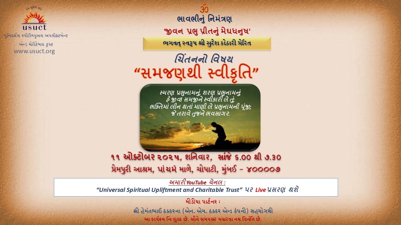 યુનિવર્સલ સ્પીરીચ્યુઅલ અપલીફ્ટમેન્ટ એન્ડ ચેરીટેબલ ટ્રસ્ટ દ્વારા તારીખ ૧૧ ઓક્ટોબર ૨૦૨૫ શનિવારે, સાંજે ૬.૦૦ થી ૭.૩૦ વાગ્યા સુધી, પ્રેમપુરી આશ્રમ, બાબુલનાંથ રોડ, મુંબઈ, ખાતે, ભક્તિ સત્સંગનું આયોજન થશે. જેમાં માનવી જીવનની મહત્તા, ધ્યેય, જીવનની વાસ્તવિકતા, જેવા કેટલાય વિષયો પર ચિંતન કરવામાં આવશે.