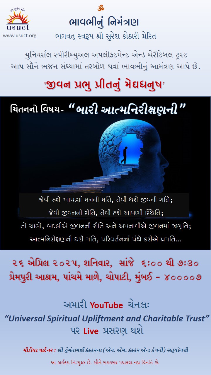 યુનિવર્સલ સ્પીરીચ્યુઅલ અપલીફ્ટમેન્ટ એન્ડ ચેરીટેબલ ટ્રસ્ટ દ્વારા તારીખ ૨૬ એપ્રિલ ૨૦૨૫ શનિવારે, સાંજે ૬.૦૦ થી ૭.૩૦ વાગ્યા સુધી, પ્રેમપુરી આશ્રમ, બાબુલનાંથ રોડ, મુંબઈ, ખાતે, ભક્તિ સત્સંગનું આયોજન થશે. જેમાં માનવી જીવનની મહત્તા, ધ્યેય, જીવનની વાસ્તવિકતા, જેવા કેટલાય વિષયો પર ચિંતન કરવામાં આવશે.